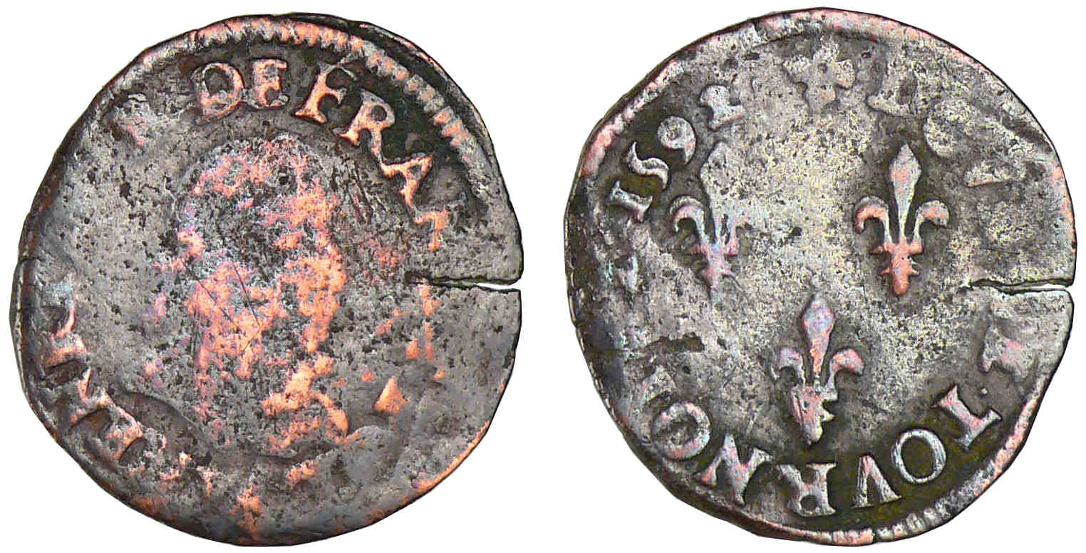 Revers : R/ + DOVBLE. TOVRNOIS (millésime). Trois lis posés aux 2ème et 1er cantons.