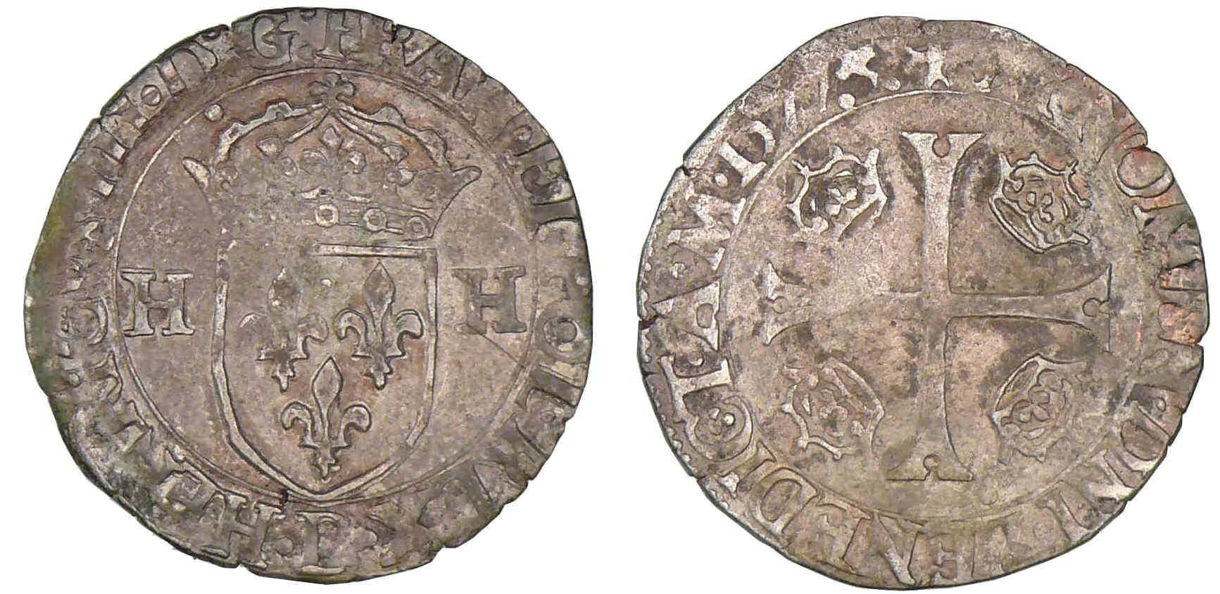 A/ HENRICVS III D G FRAN ET POL REX. Ecu de France couronné et accosté de deux H.