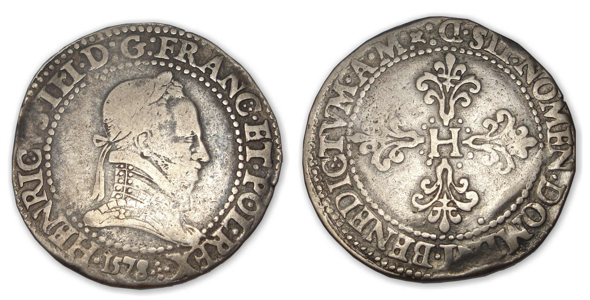Avers : A/ + HENRICVS. III. D. G. FRANC. ET. POL. REX (5 points) 1578. Buste lauré et cuirassé à droite, au col plat. Lettre d’atelier sous le buste.