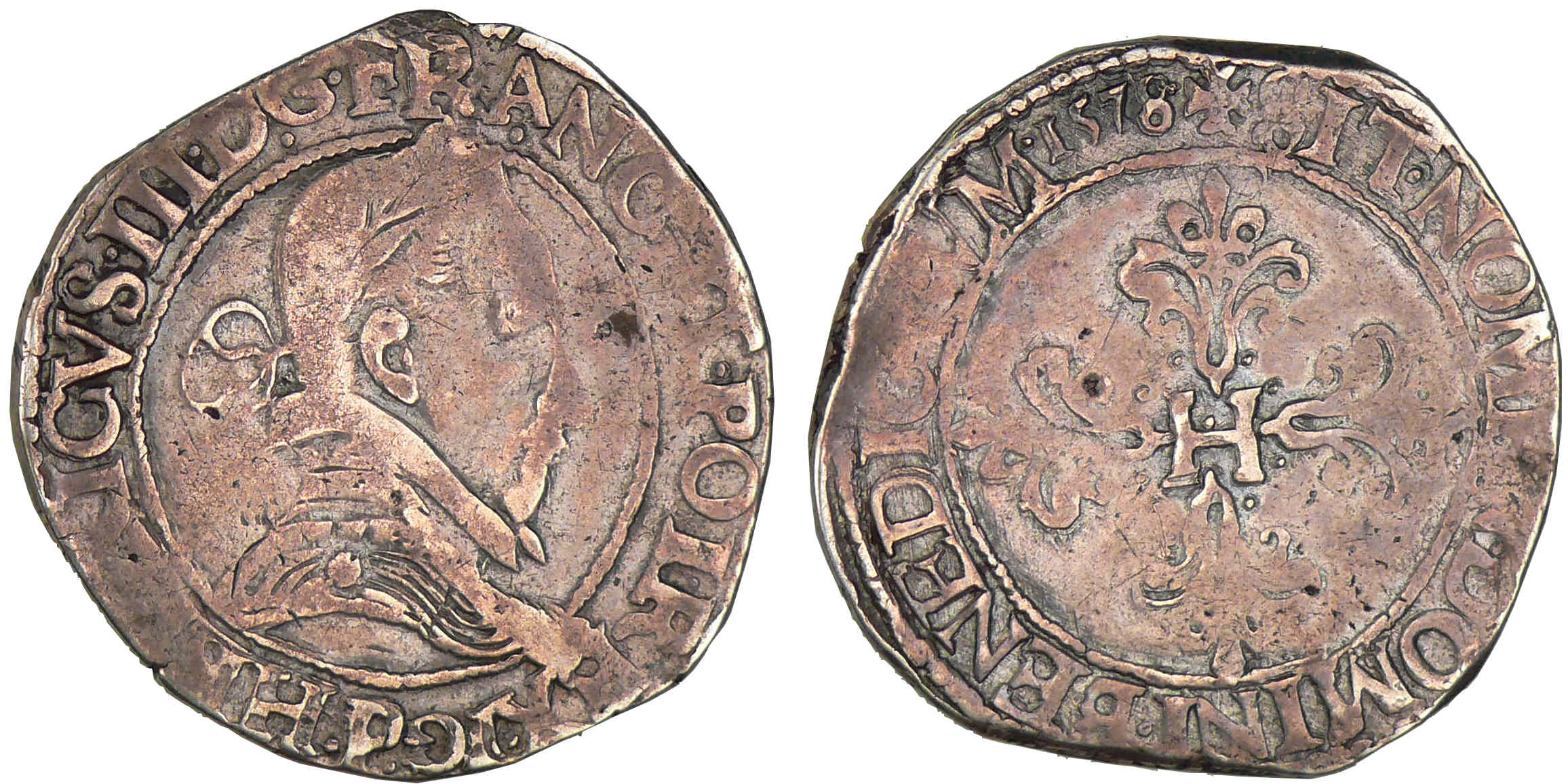 A/. HENRICVS. III. D. G. FRANC. ET. POL. REX. Buste au col plat, lauré et cuirassé à droite. Lettre d’atelier sous le buste.