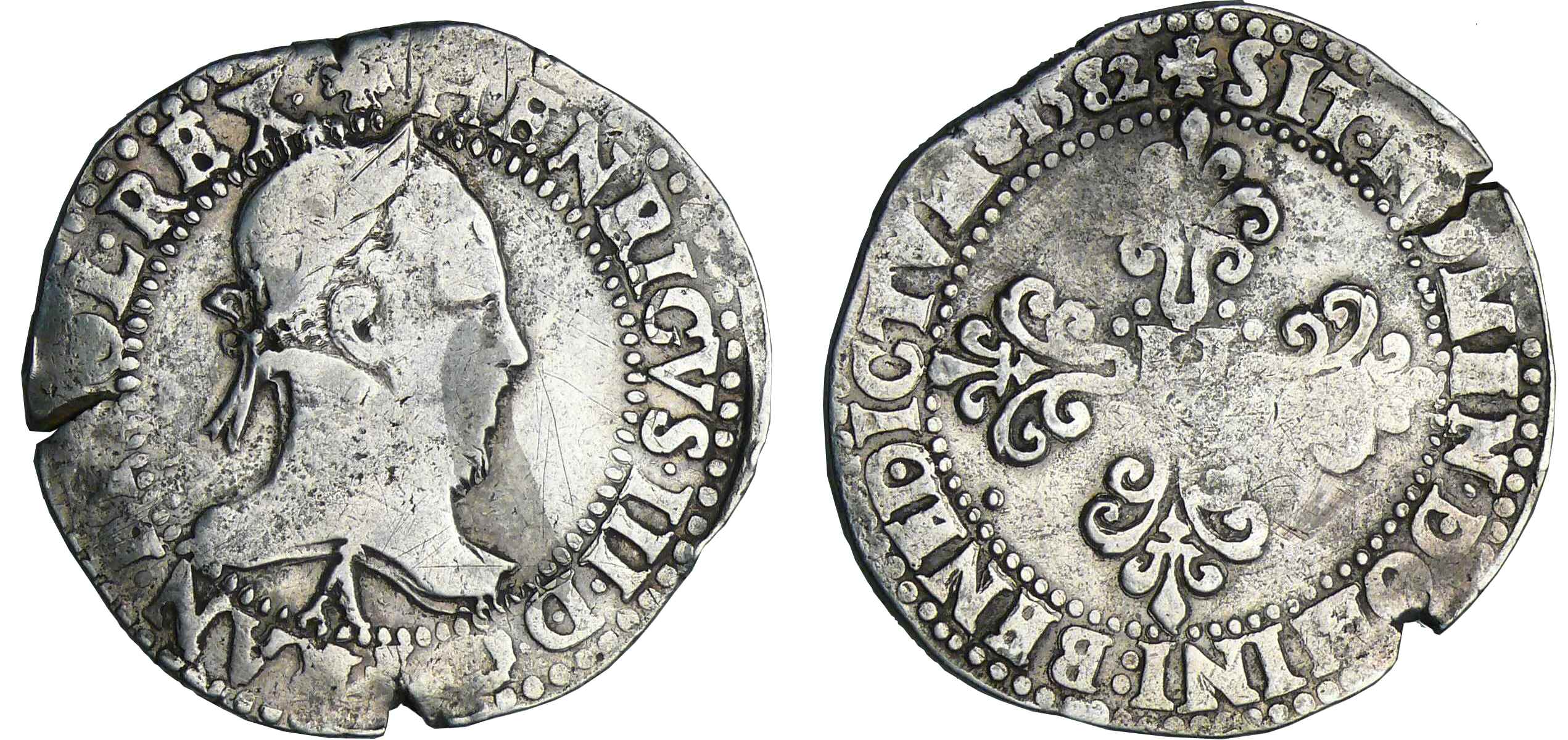 Avers : A/ + HENRICVS. III. D. G. FRAN. ET. POL. REX Buste lauré et cuirassé à droite, au col plat. Lettre d’atelier sous le buste.