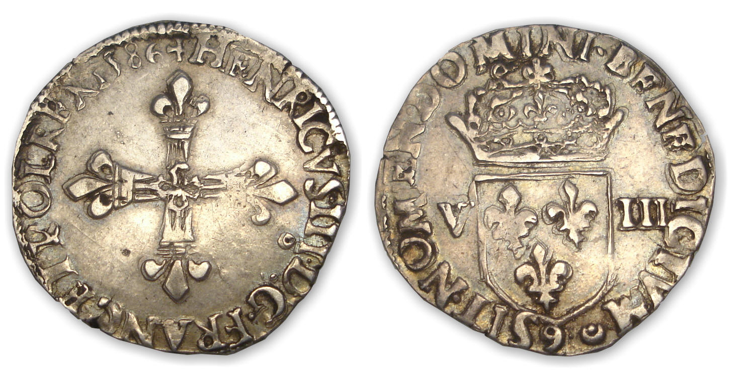 Avers : A/ + HENRICVS. III. D. G FRANC. ET. POL. REX 1586. Croix fleurdelisée.