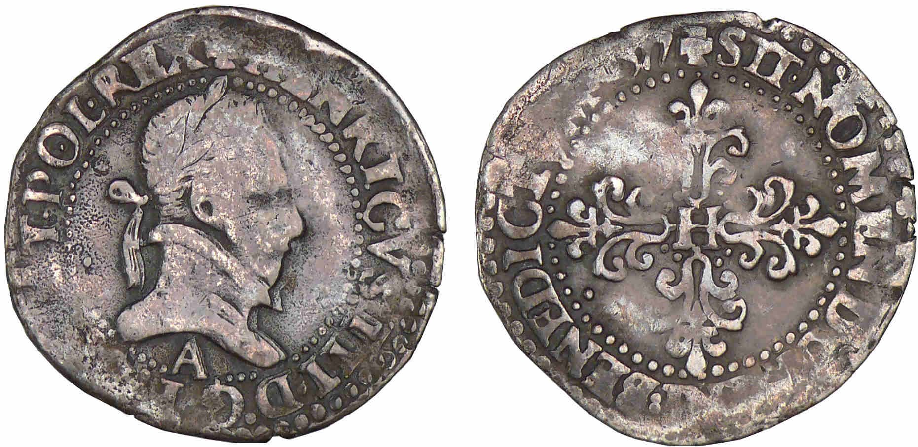 Avers : A/. HENRICVS. III. D. G. FRAN. ET. POL. REX. Buste au col plat, lauré et cuirassé à droite. Lettre d’atelier sous le buste.