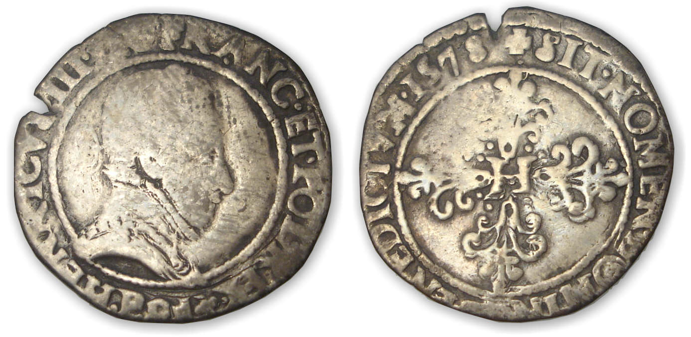 Avers : A/ HENRICVS. III. D. G. FRANC. ET. POL. REX (trèfle)(FG) Buste lauré et cuirassé à droite, au col plat. Lettre d’atelier sous le buste.