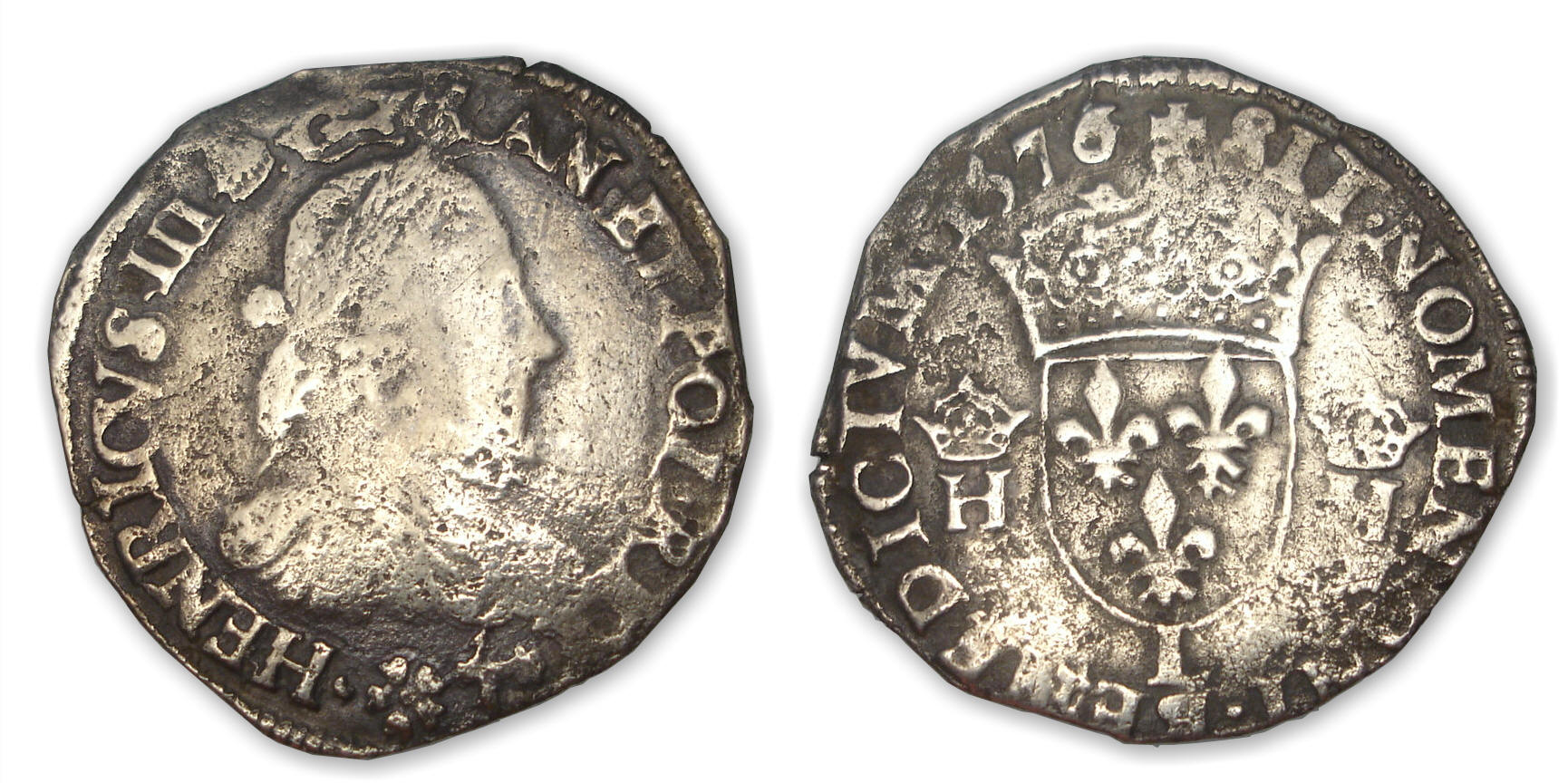 Avers : A/ HENRICVS. III. D. G. FRAN. ET. POL. REX (ancre) (fleur) Buste au col plat, lauré et barbu à droite.