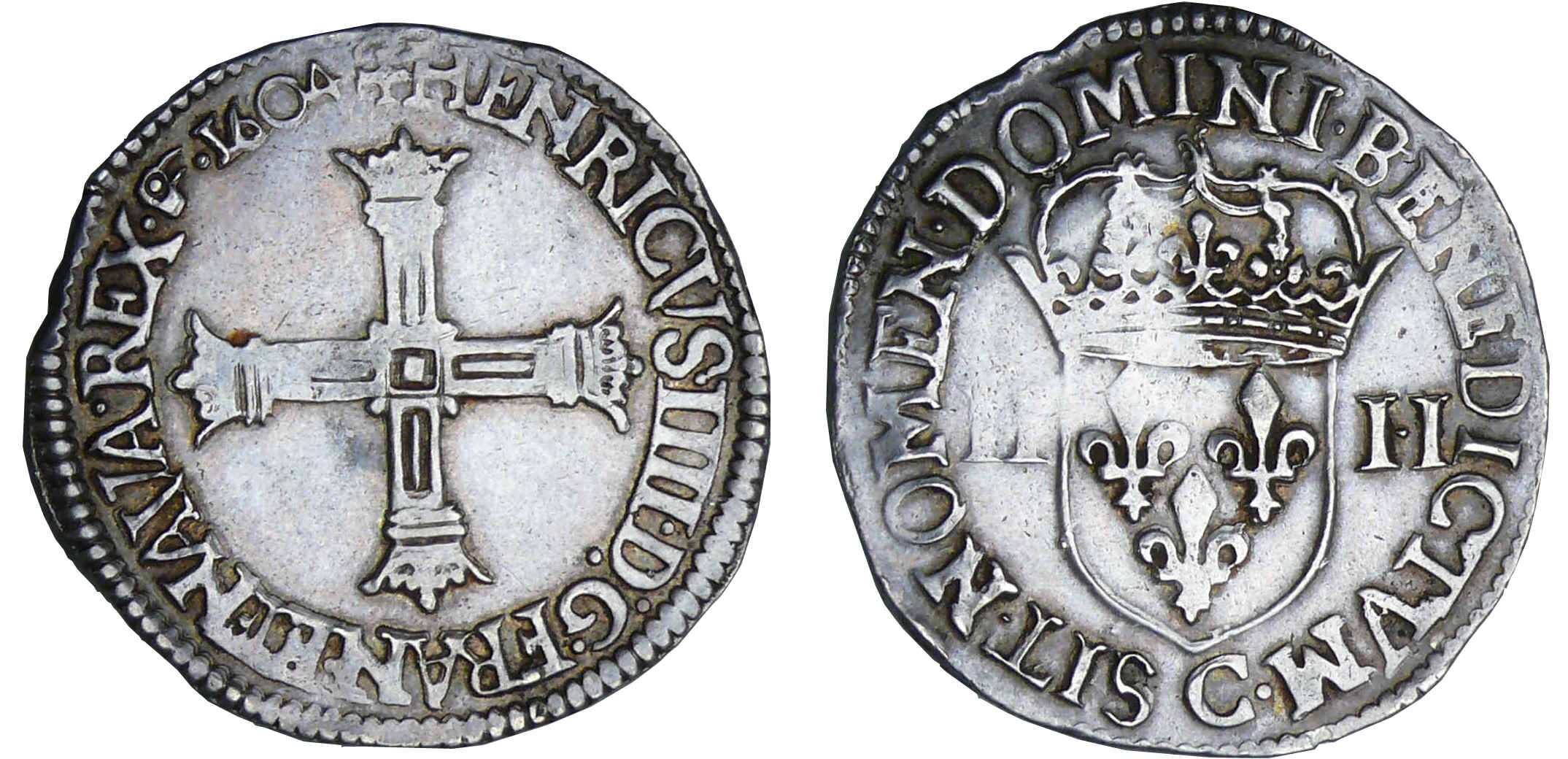 Avers : A/ + HENRICVS. IIII. D. G. FRAN. ET. NAVA. REX. Croix formée de quatre bâtons couronnés.