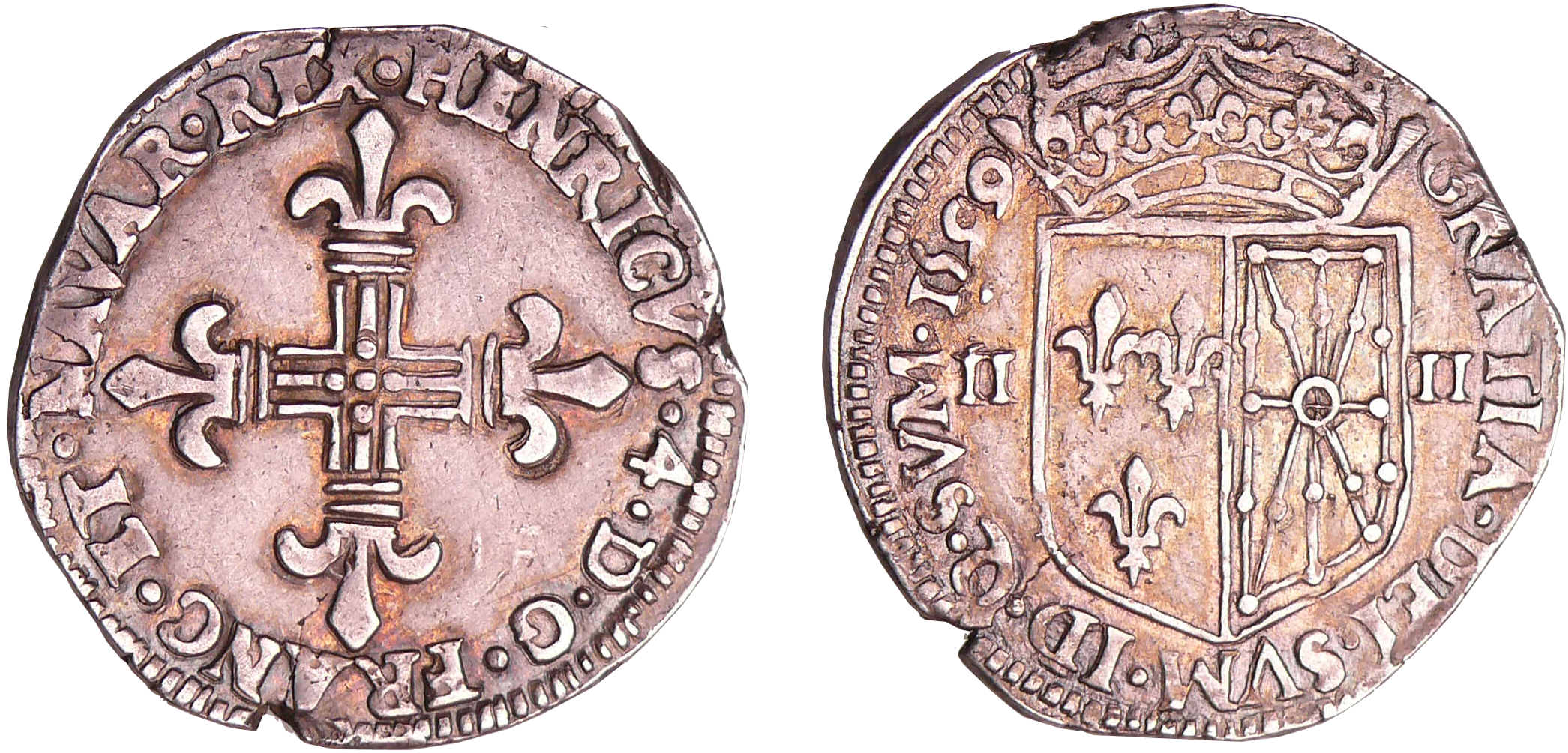 R/ GRATIA. DEI. SVM. ID. Q. SVM Ecu couronné de France-Navarre, accosté de II – II.