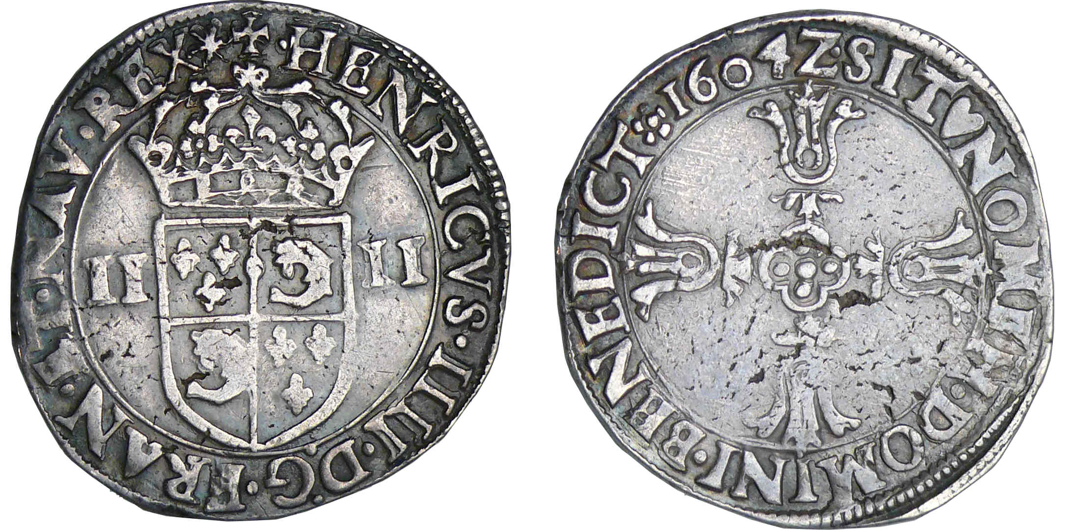 Avers : A/ + HENRICVS. IIII. D: G. FRAN. ET. NAV. REX (soleil à 6 rayons). Ecu de France couronné écartelé aux 1er et 4ème de France, aux 2ème et 3ème de Dauphiné, accosté de II – II.