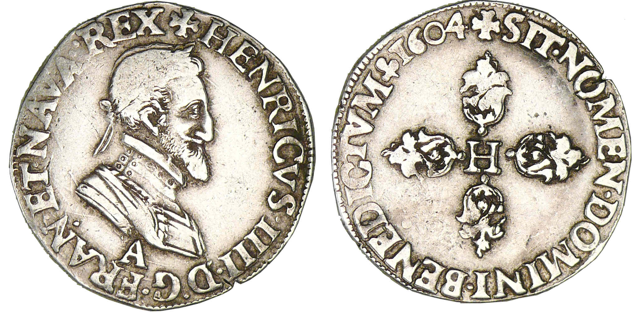 A/ + HENRICVS IIII D G FRAN ET NAVA REX. Buste lauré et cuirassé à droite. Lettre d’atelier sous le buste.