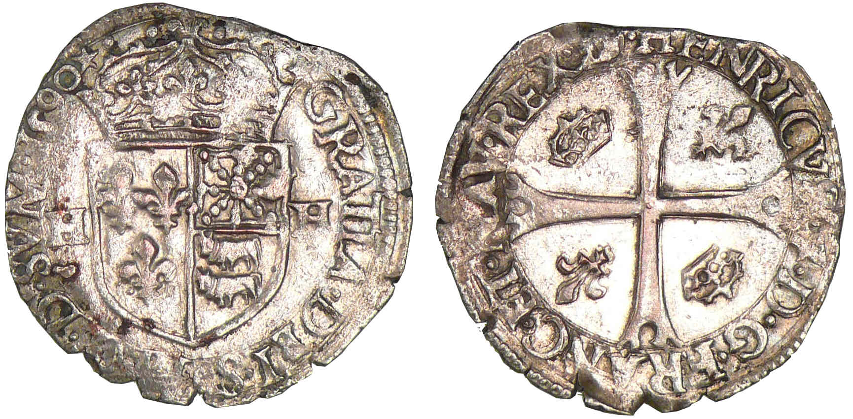 Avers : A/ HENRICVS. 4. D. G. FRANC. ET. NAV. REX. (D et B liés). Croix échancrée et cantonnée d’un lis aux 1er et 4ème, d’une couronne aux 2ème et 3ème.