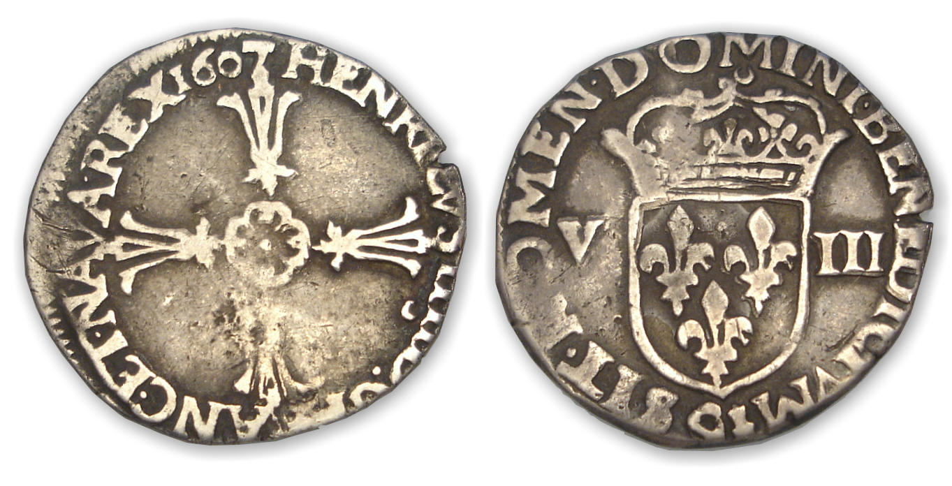 Avers : A/ + HENRICVS. IIII. D. G FRANC. ET. NAVA REX 1607. Croix feuillue avec quadrilobe en cœur.