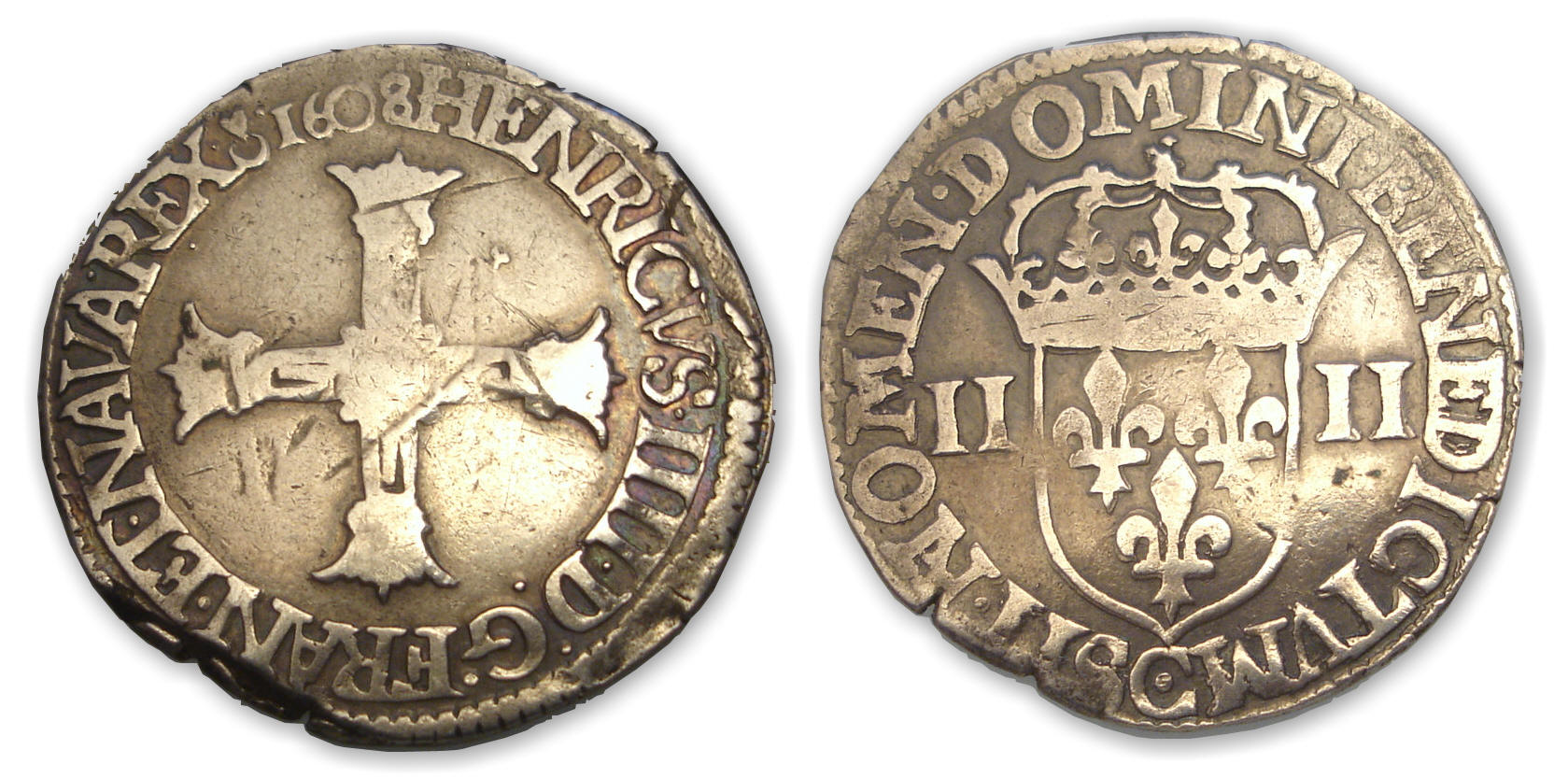 Avers : A/ + HENRICVS. . IIII. D. G. FRAN. ET. NAVA. REX 1608. Croix formée de quatre batons couronnés.