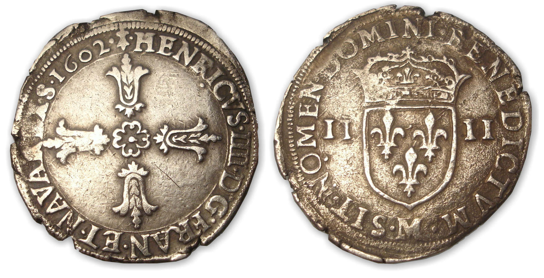 Avers : A/ + HENRICVS. IIII. D. G. FRAN. ET. NAVA. REX 1602. Croix feuillue avec quadrilobe en cœur.