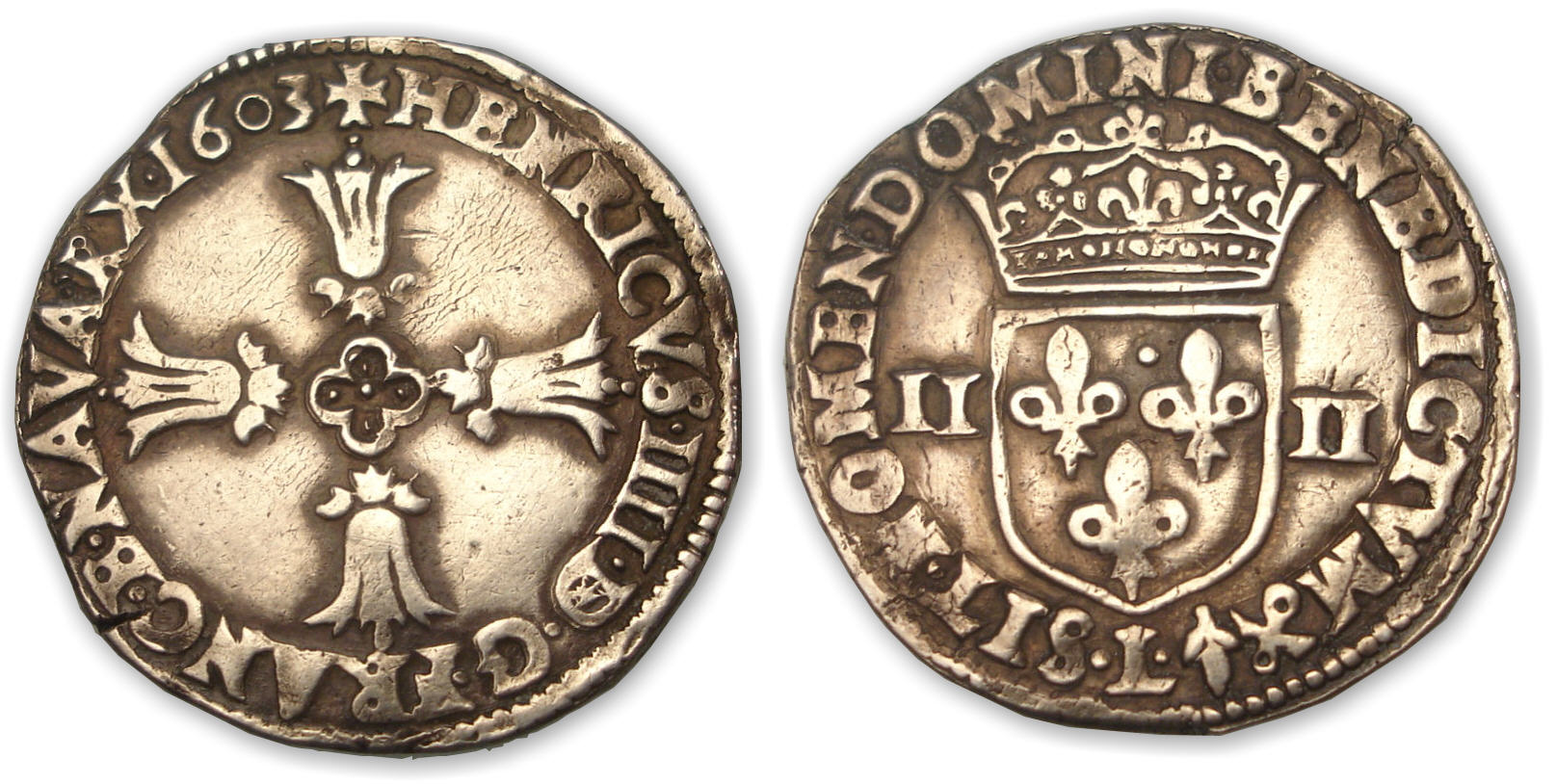 Avers : A/ + HENRICVS. IIII. D. G. FRANC. E. NAVA. RX 1603. Croix feuillue avec quadrilobe en cœur.
