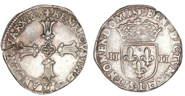 A/ + HENRICVS IIII D G. FRANC. E. NAVA. RX (millésime). Croix feuillue avec quadrilobe en cœur.