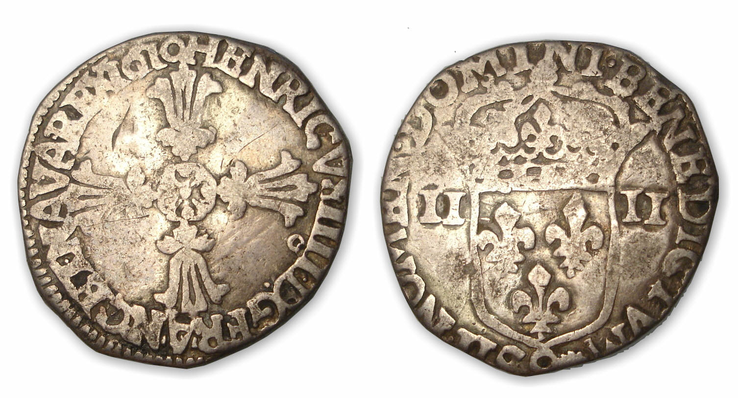 Avers : A/ + HENRICVS. IIII. D. G. FRANC. ET. NAVA. REX 1610. Croix feuillue avec quadrilobe en cœur.