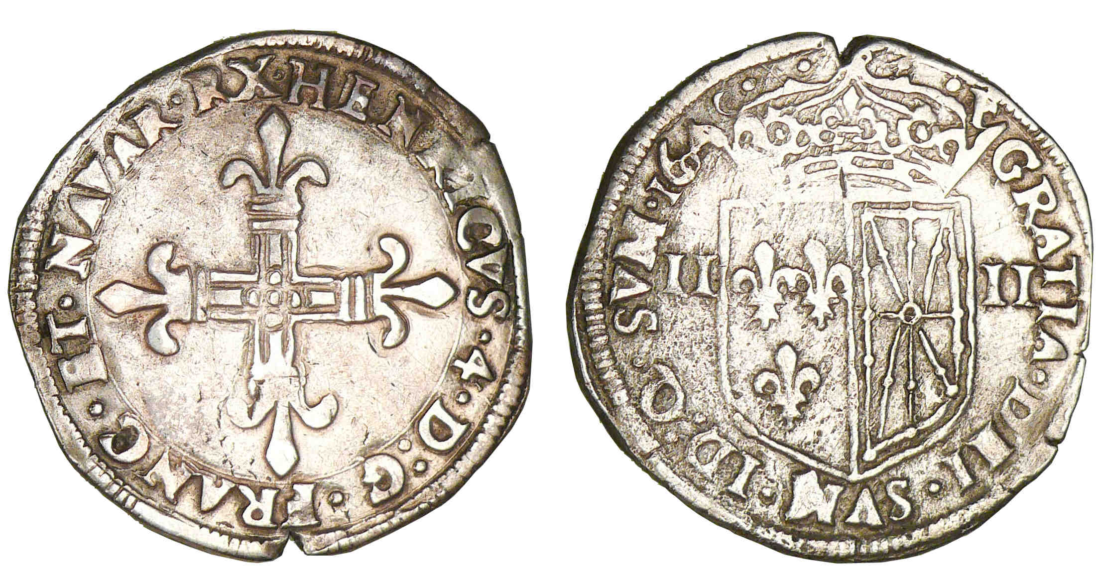 R/ GRATIA. DEI. SVM. ID. Q. SVM (millésime). Ecu couronné de France-Navarre, accosté de II – II.