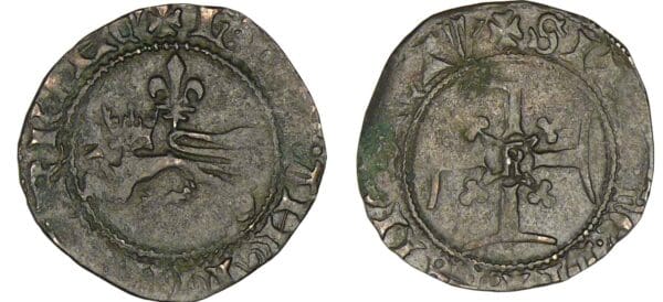 A/ + h: REX: ANGL’: hERES: FRANC. Léopard couronné passant à gauche sous un lis.
