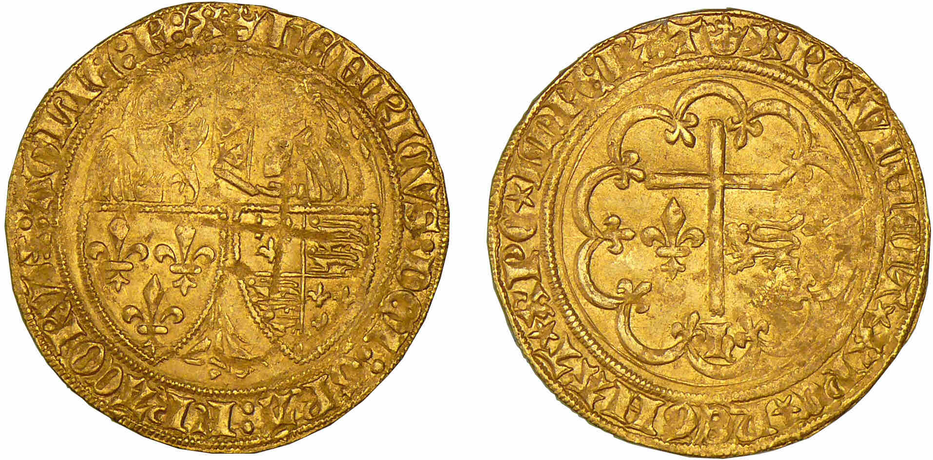 Avers : A/ (couronnelle) hENRICVS: DEI: GRA: FRA’CORV: Z: AGLIE: REX. L’archange Gabriel saluant la Vierge. Au-dessous les écus accostés de France et de France-Angleterre. Gabriel tend un volume inscrit AVE.