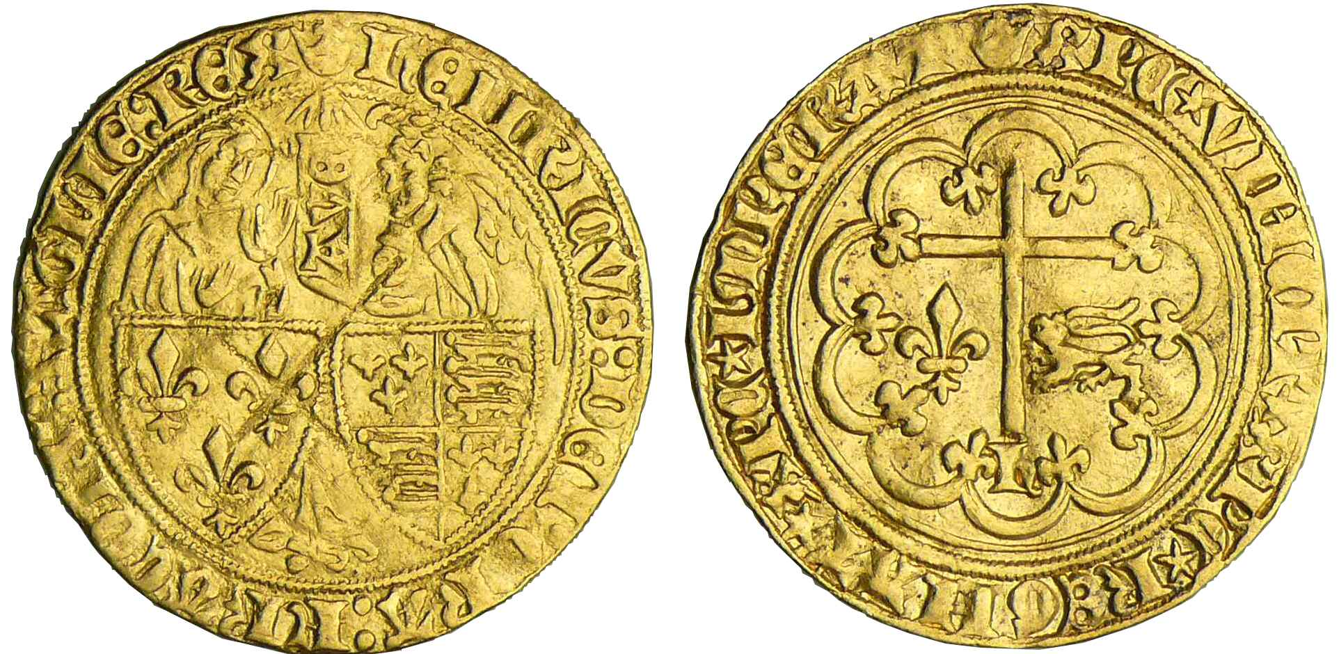 Avers : A*/ (couronnelle) hENRICVS: DEI: GRA: FRA’CORV: Z: AGLIE: REX. L’archange Gabriel saluant la Vierge. Au-dessous les écus accostés de France et de France-Angleterre. Gabriel tend un volume inscrit AVE.