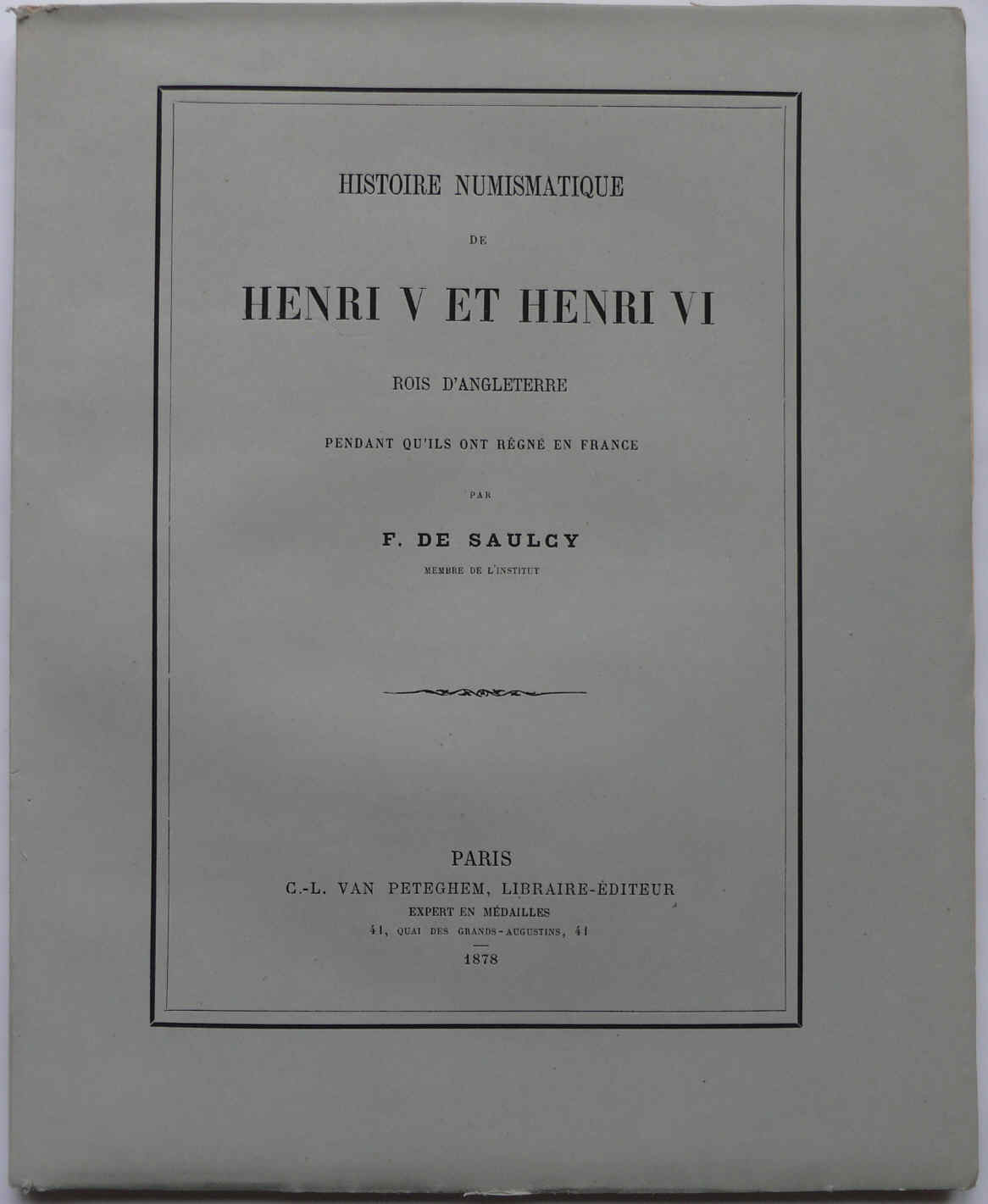 Avers : Paris 1878 – Histoire numismatique de Henri V et Henri VI rois d’Angleterre pendant qu’ils ont régné en France par F De Saulcy. 123 pages et 4 planches en taille douce.