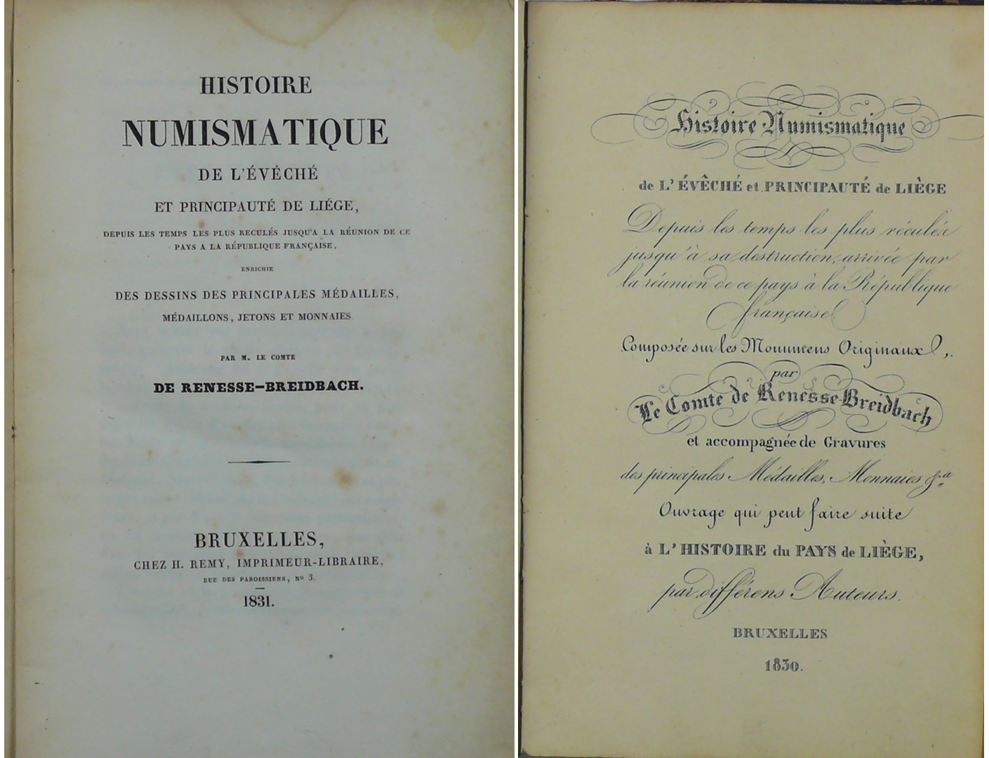 Histoire numismatique de l’Evêché et principauté de Liége – 2 volumes textes et planches, Conte de Renesse-Breidbach, 1831 édition originale