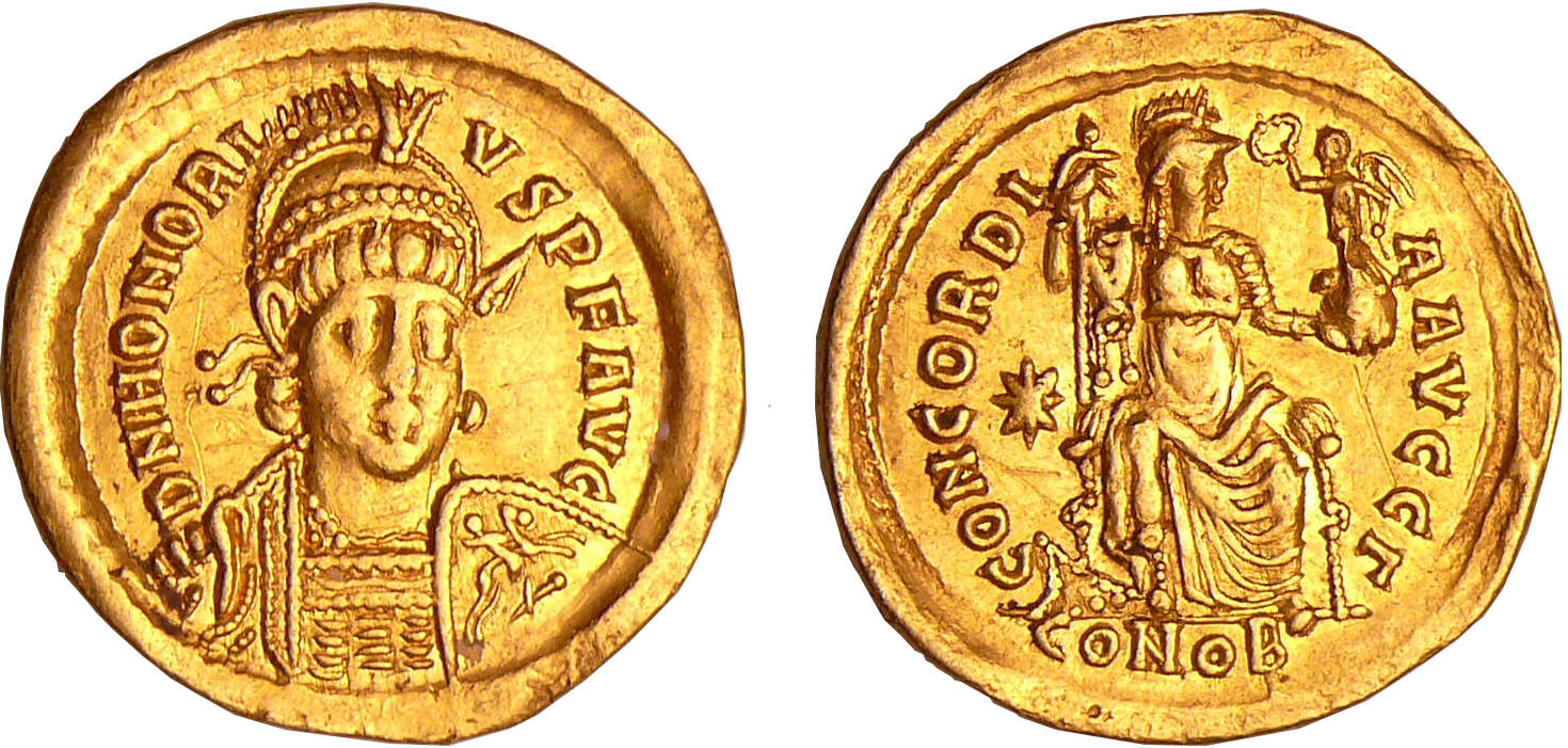 Revers : R/ CONCORDIA AVGGΓ // CONOB. Rome assise de face, regardant à droite, tenant un sceptre et un globe surmonté d’une Victoire, une étoile dans le champ à gauche.