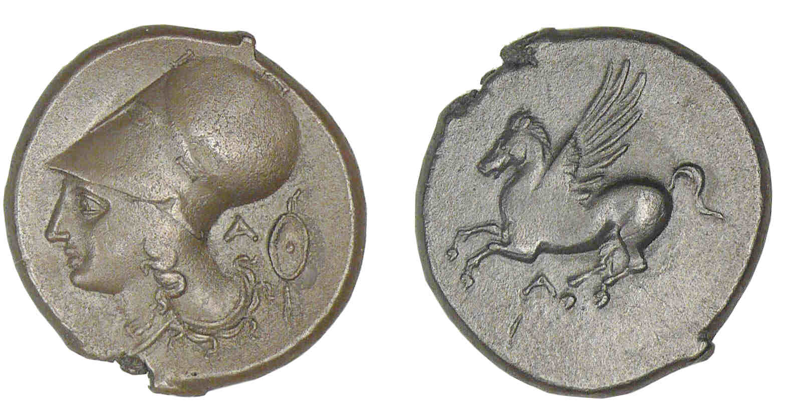Avers : A/ Λ. Tête d’Athéna casquée, un bouclier derrière la tête.