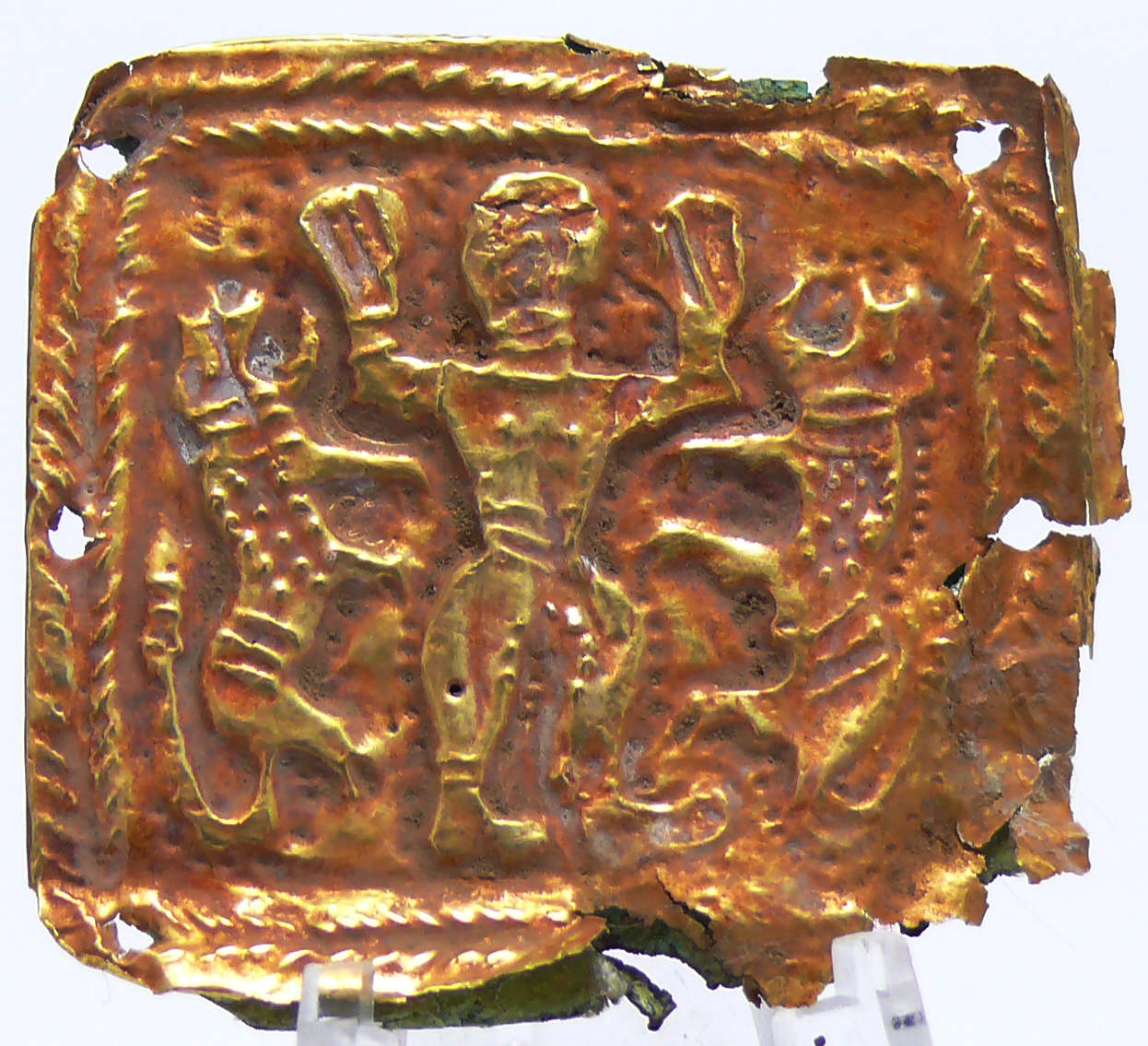 Avers : Plaquette en or représentant un homme debout levant les mains. Le personnage est accosté de 2 fauves. La plaquette est rivetée à une plaque de cuivre. Poids 5.59 gr. Dimensions : 40×40 mm.