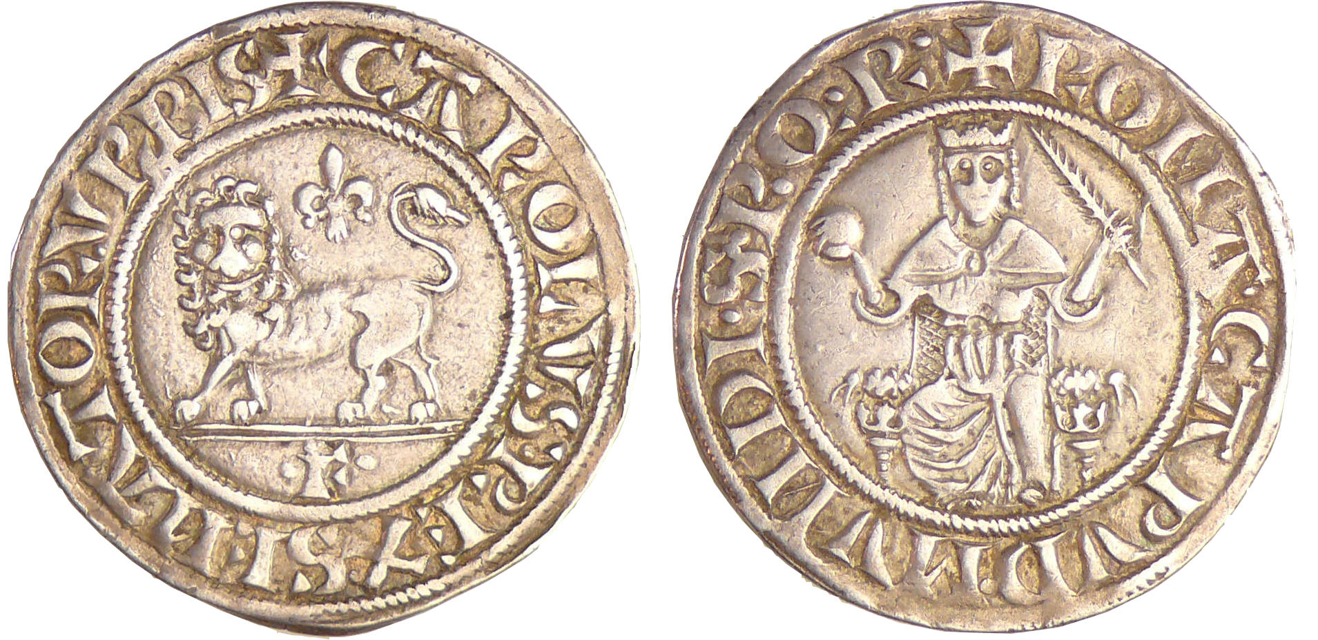 A/ CAROLVS REX SENATOR VRBI lion à gauche sommé d’un lis.