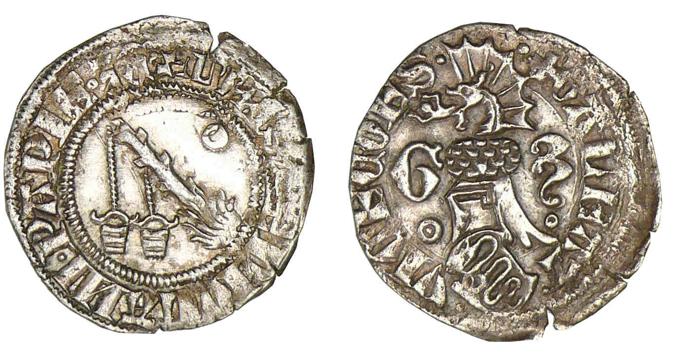 R/ Un tison enflammé et deux sceaux. Au-dessus, un globule.