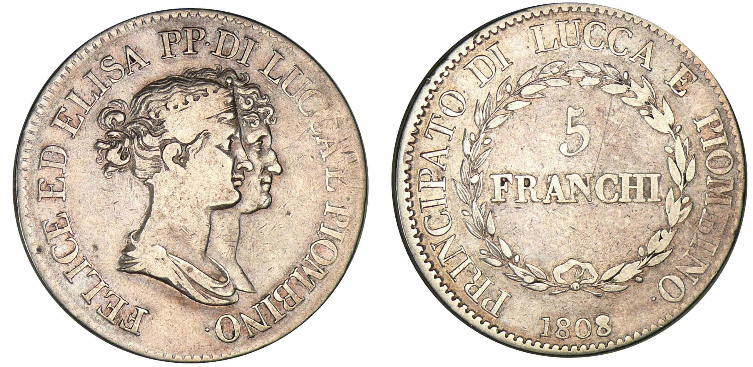 Italie – Principauté de Lucques et Piombino – Félix Bacciochi et Elisa Bonaparte – 5 franchi 1808 (Florence)