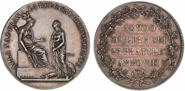 Avers : A/ La France casquée, assise, accueille la République Cisalpine. A gauche sur le socle : Salvirch. ALLA NAZ . FRAN . LA REP . CISAL . RICONOSCENTE