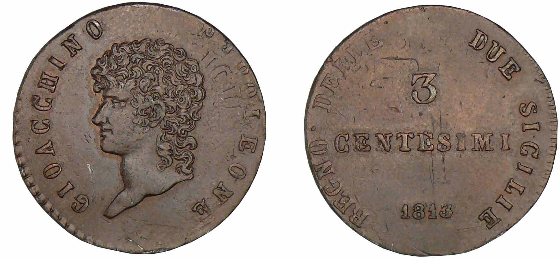 R/ 3 CENTESIMI. 1813 en 3 lignes, dans le champ. REGNO DELLE DUE SICILIE