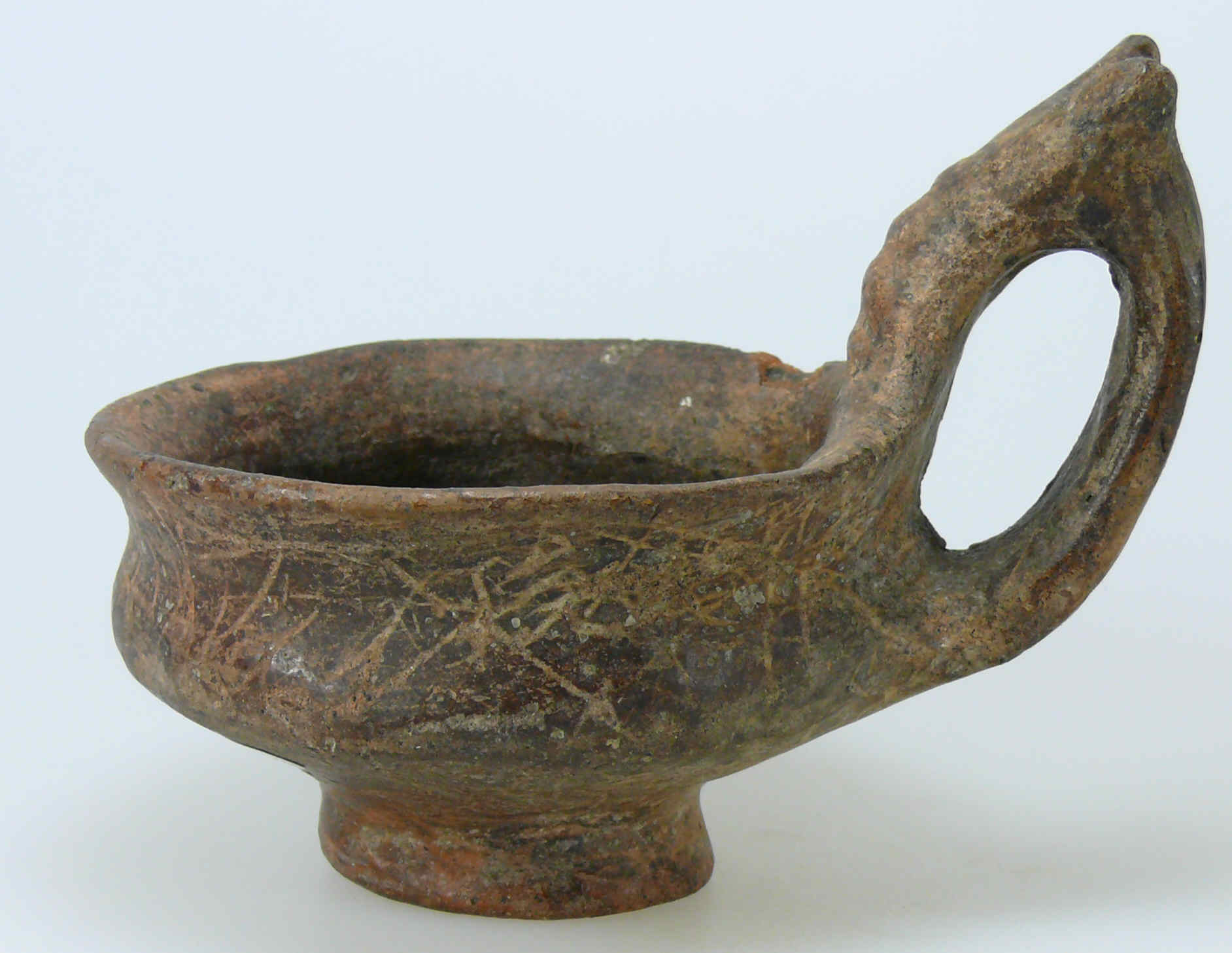 Avers : Très beau kythos en terre cuite de couleur foncée ayant une large et haute anse ornée de 2 pointes. 85 mm de hauteur.