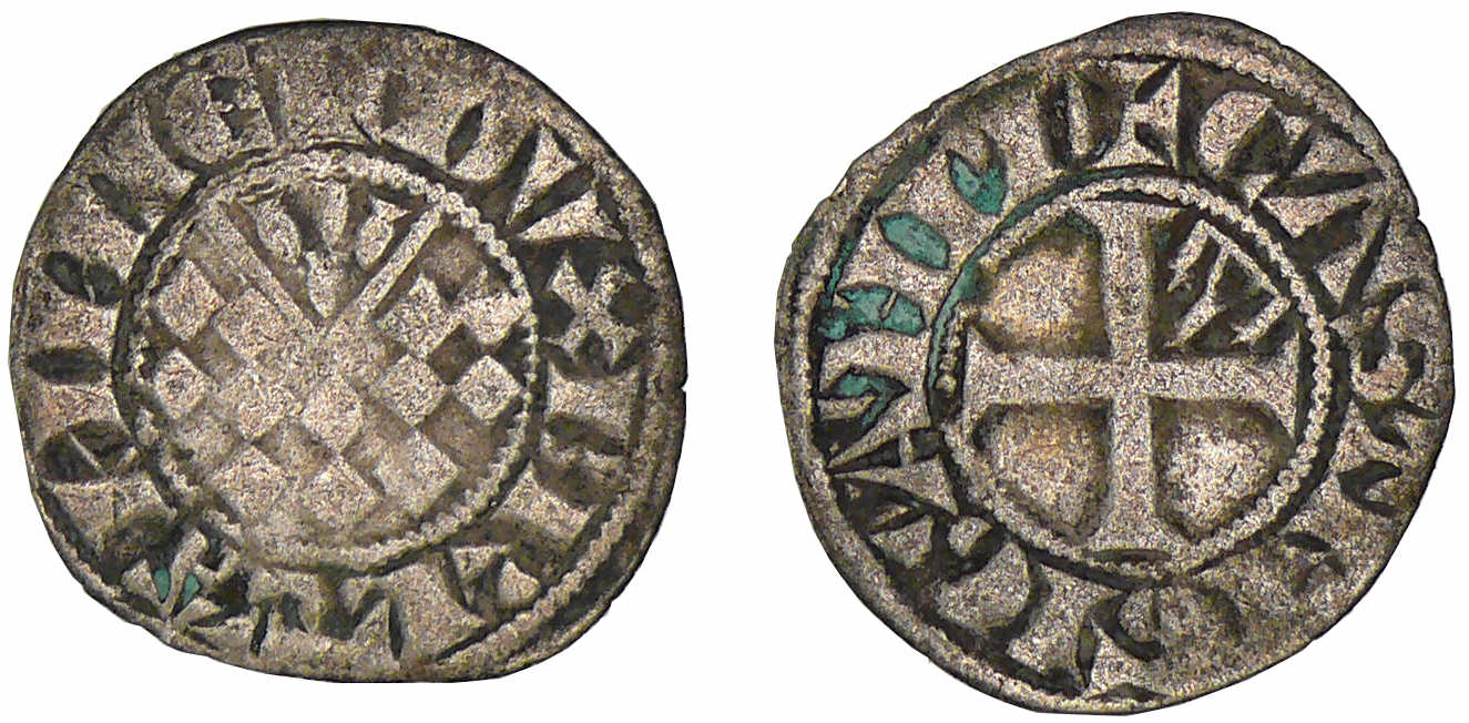 Avers : A/ + DVX BRITArrIE@ – Echiqueté de Dreux au franc quartier d’hermine contenant quatre mouchetures.