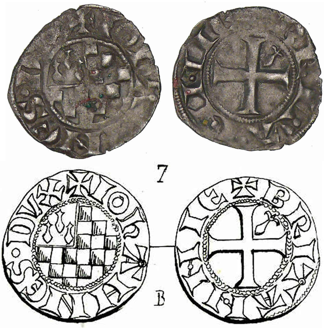Avers : A/ + IoJAHHES DVX@ – Dreux au franc quartier d’hermine, occupant le quart du champ, contenant trois mouchetures.