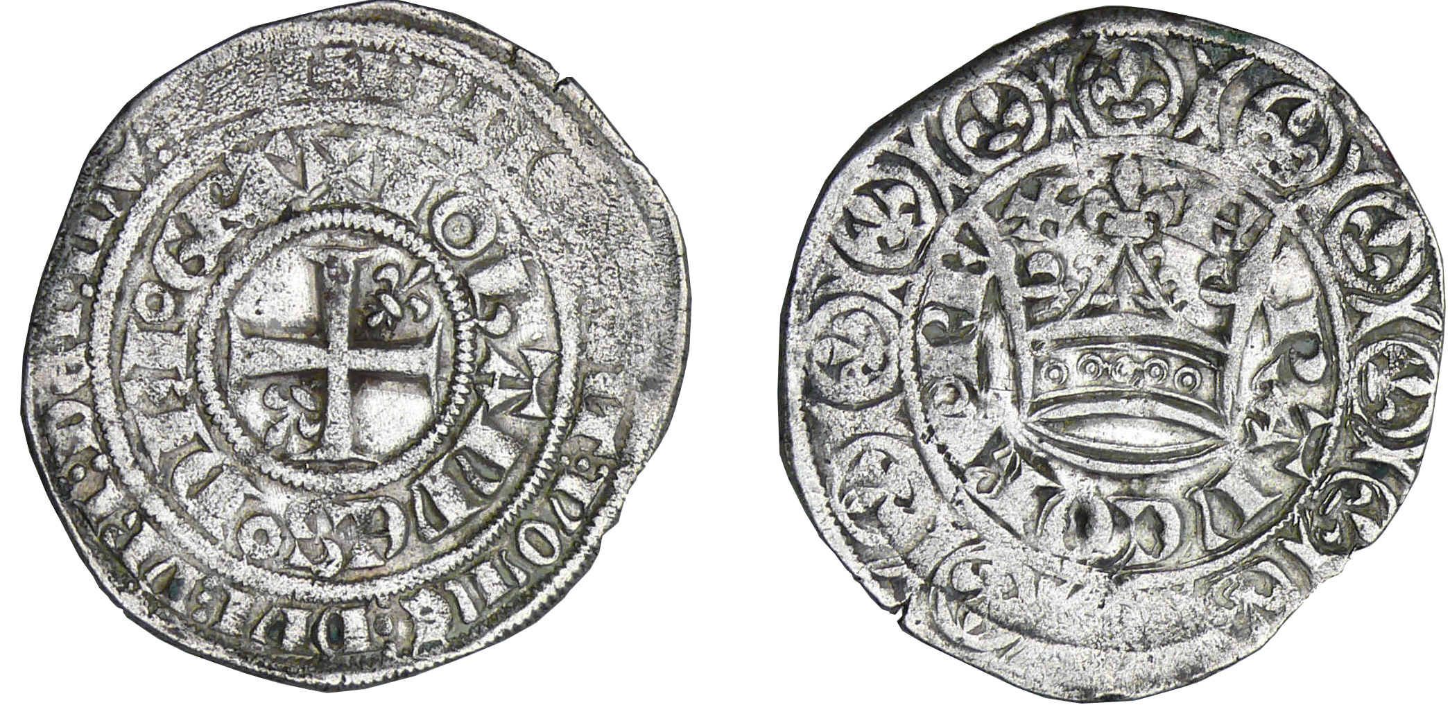A/ + IOhAnnES• DEI• GRA, (N onciales), légende extérieure : BNDICTV: SIT: nOmE: DnI: NRI: DEI: IhV: XPI. Croix cantonnée d’un lis aux 2ème et 3ème cantons.