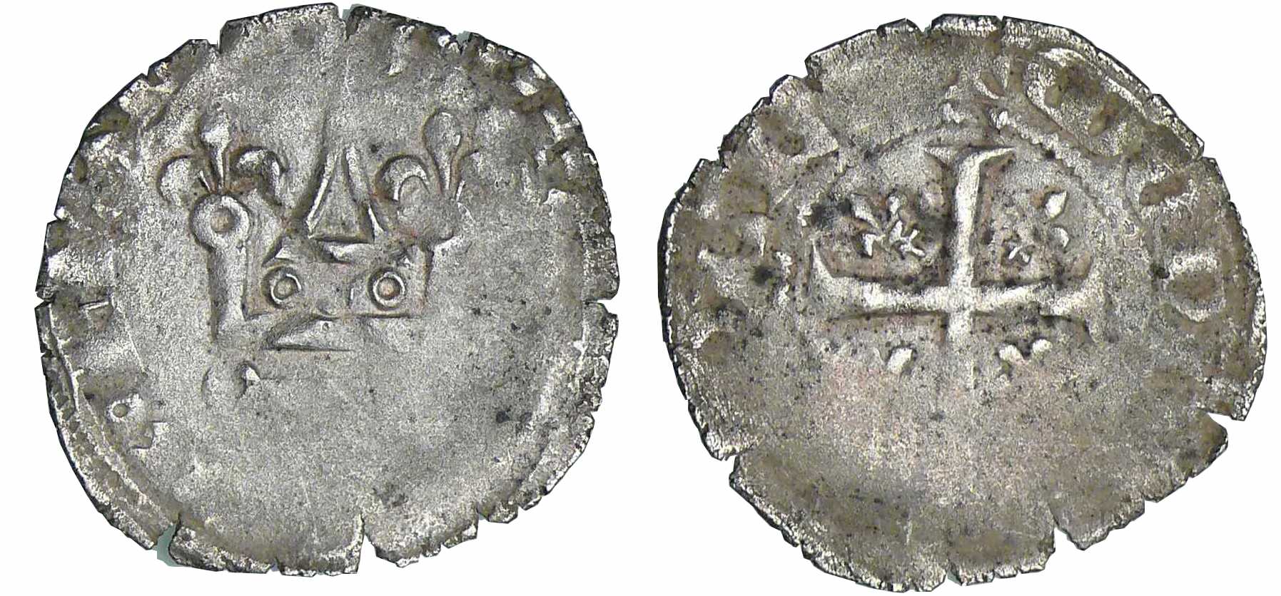 R/ + MONETA DVPLEX. Croix latine coupant la légende cantonnée de quatre lis.