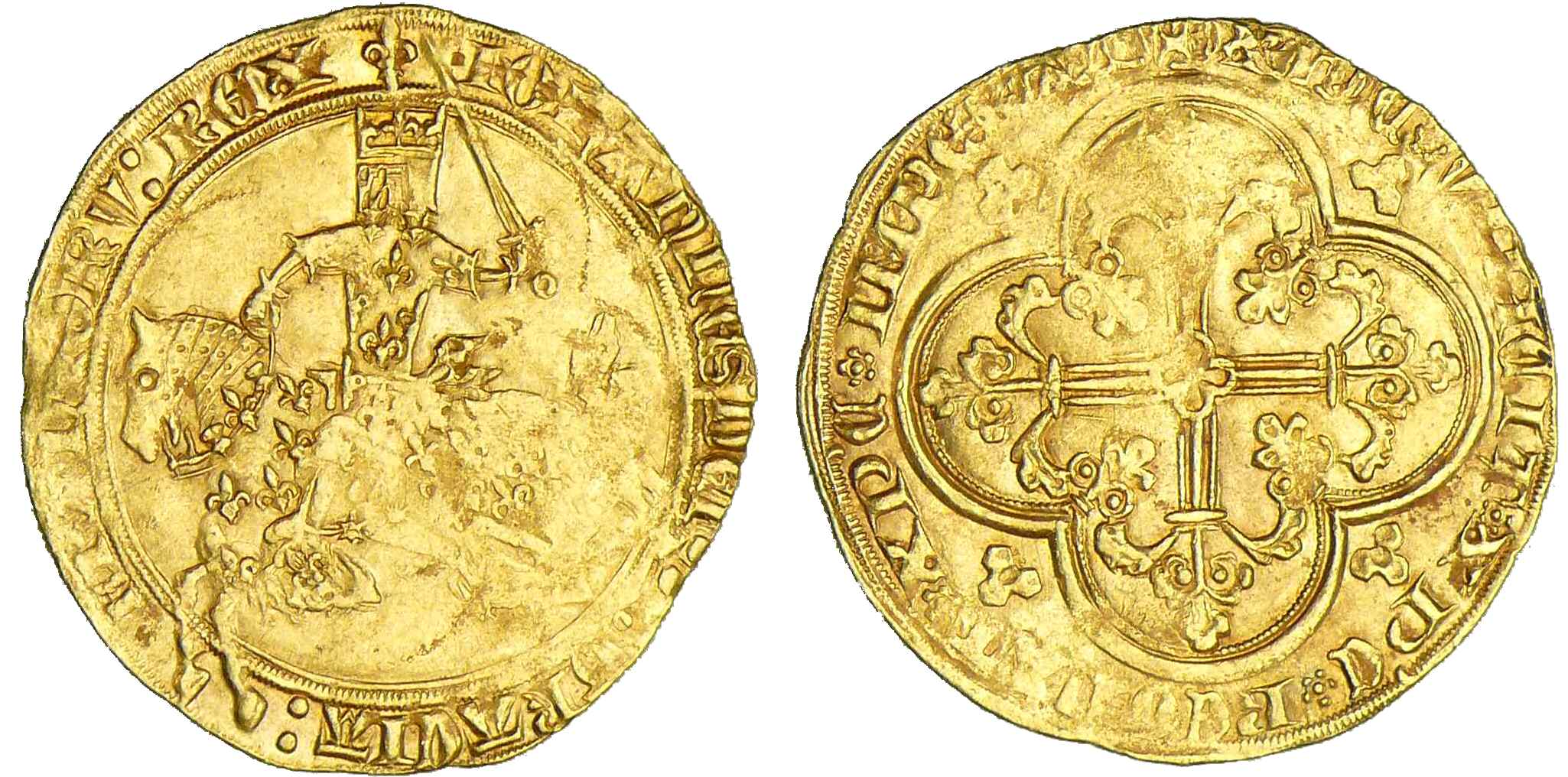 A/ IOhAnnES: DEI – :GRACIA: – FRAnCOR: REX. Jean II chevauchant à gauche, l’épée haute, coiffé d’un heaume.