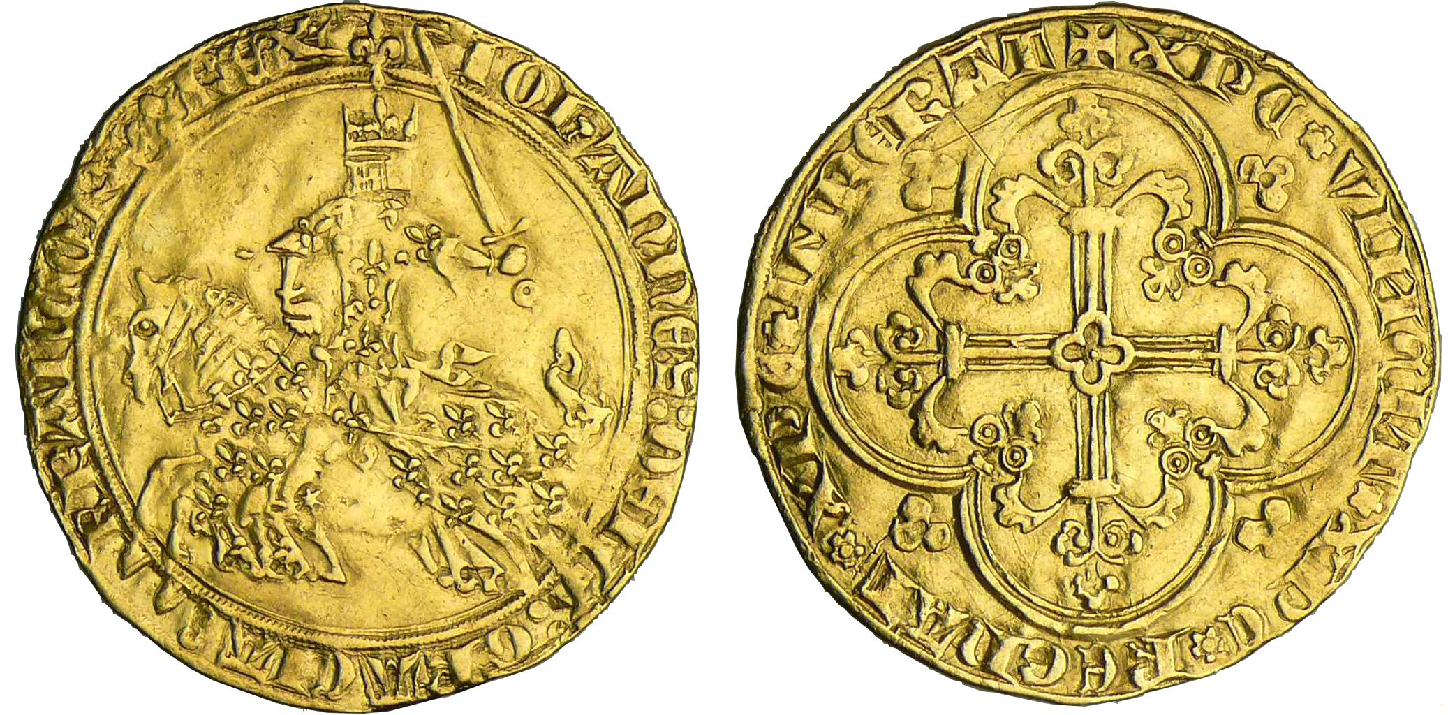 Avers : A/ IOhAnnES: DEI – :GRACIA: – FRAnCOR: REX. Jean II chevauchant à gauche, l’épée haute, coiffé d’un heaume.