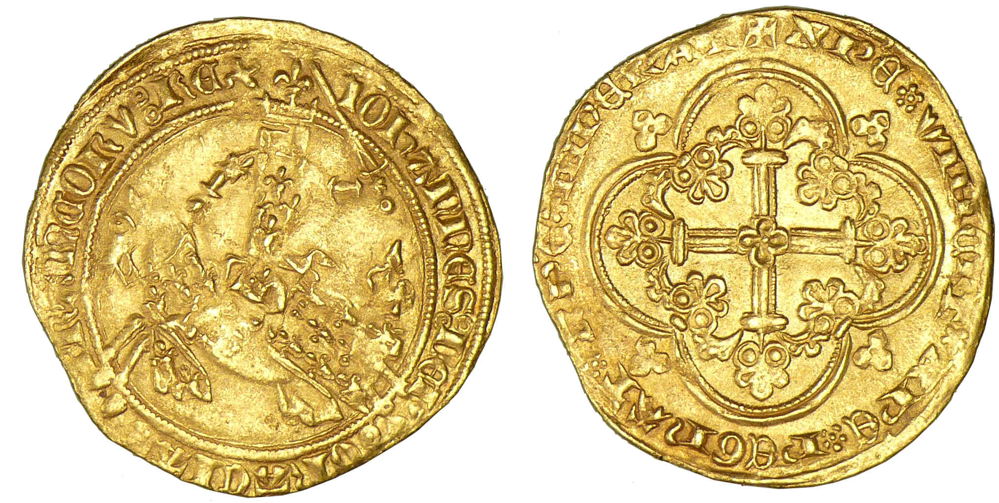 Avers : Jean II dit le Bon (1350-1364). A/ IOhAnnES: DEI – :GRACIA: – FRAnCOR: REX. Jean II à cheval, galopant à gauche, l’épée haute, coiffé d’un heaume.