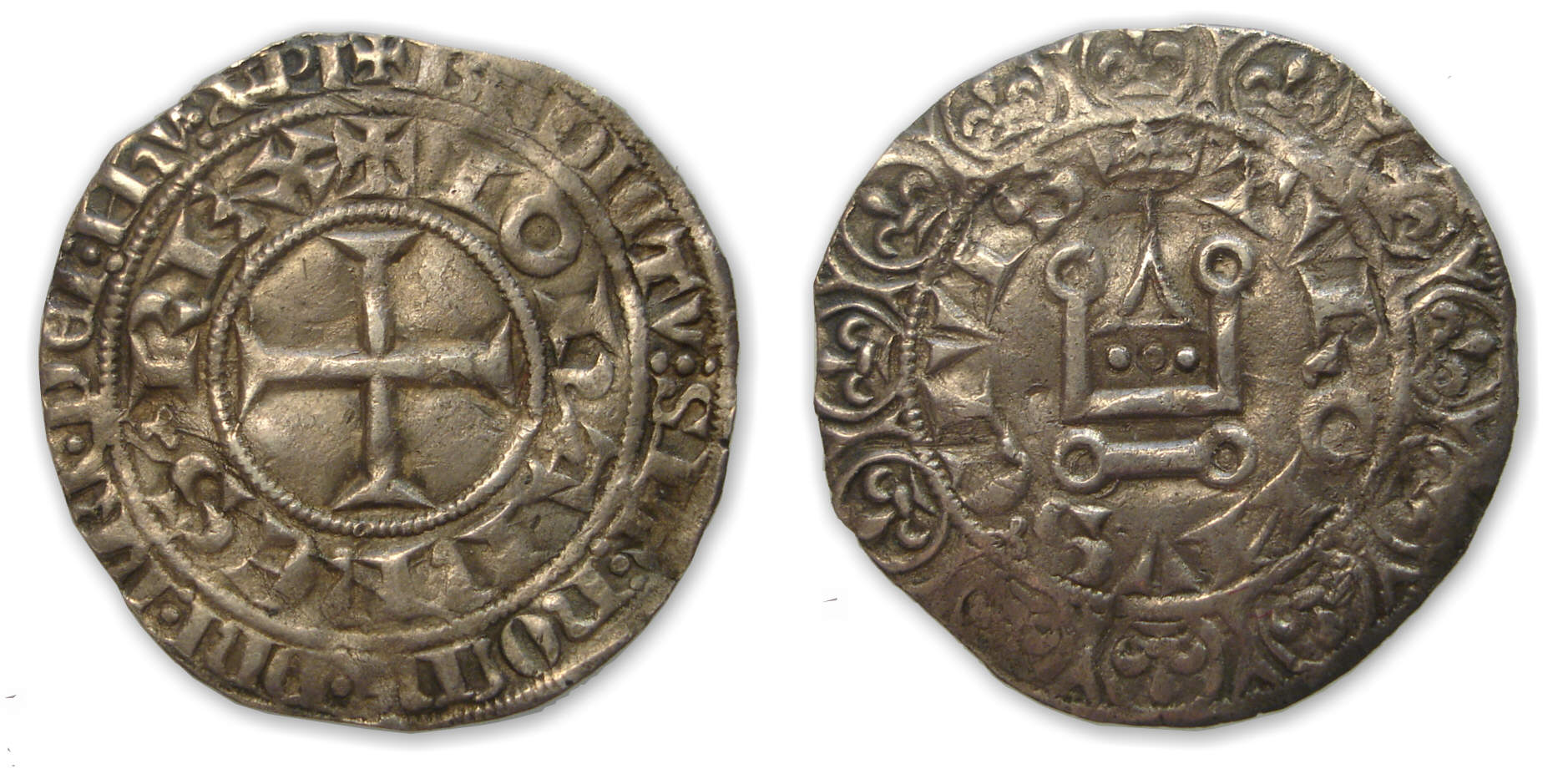 R/ (Couronne) TVRONVS (trèfle) CIVIS Châtel tournois couronné, bordure à douze lis.