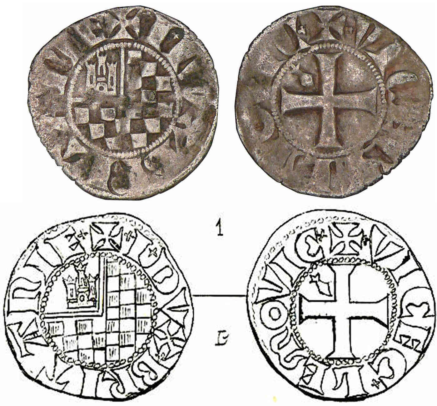 Avers : A/ + ÅIÅ DVXÅBpITAnIeÅ – Echiqueté de Dreux au franc quartier, portant le châtel à trois tours de Castille.