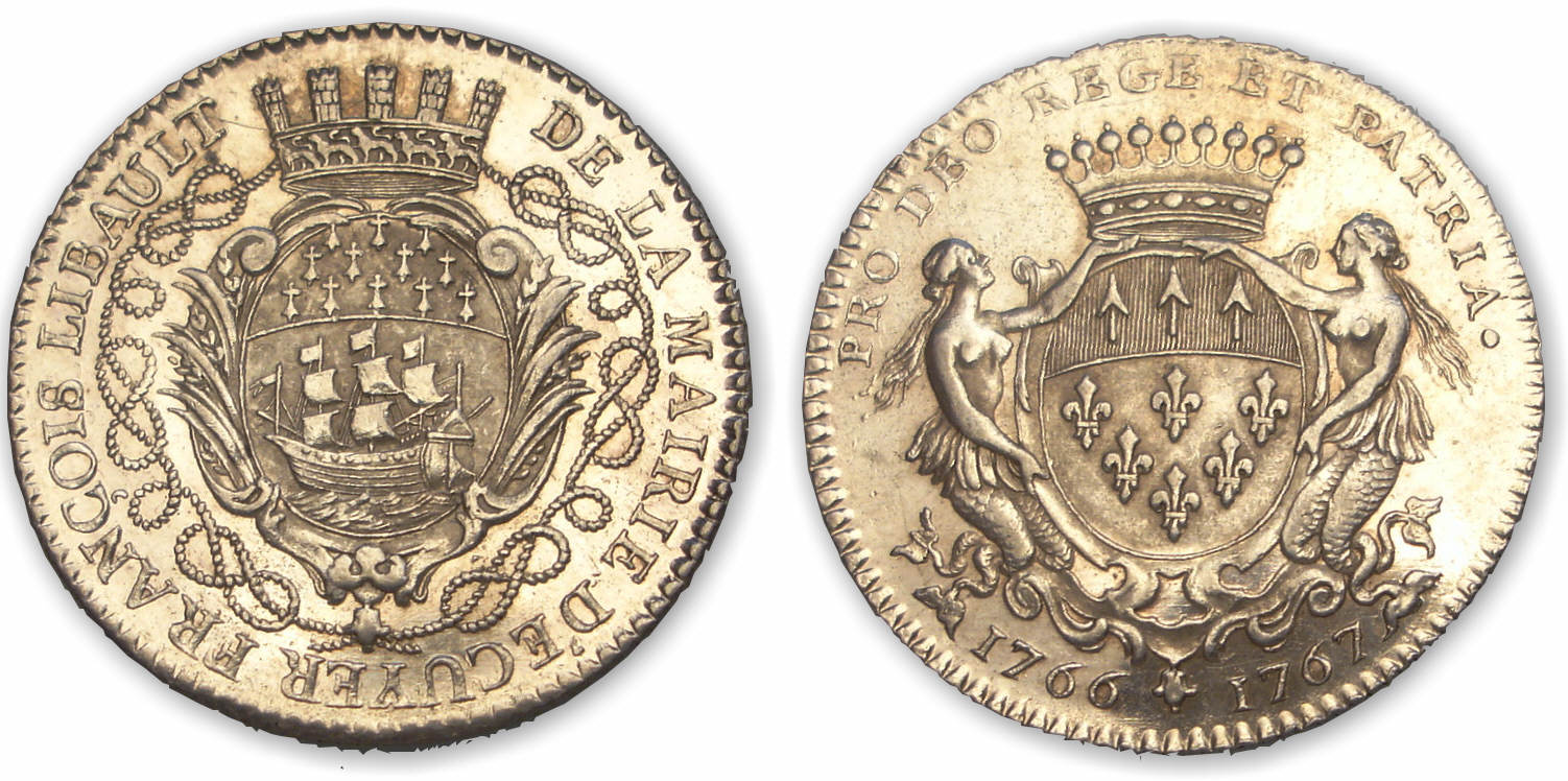 Avers : A/ PRO DEO REGE ET PATRIA // 1766 – 1767. Écu couronné aux armes de François Libault et soutenu par deux sirènes.
