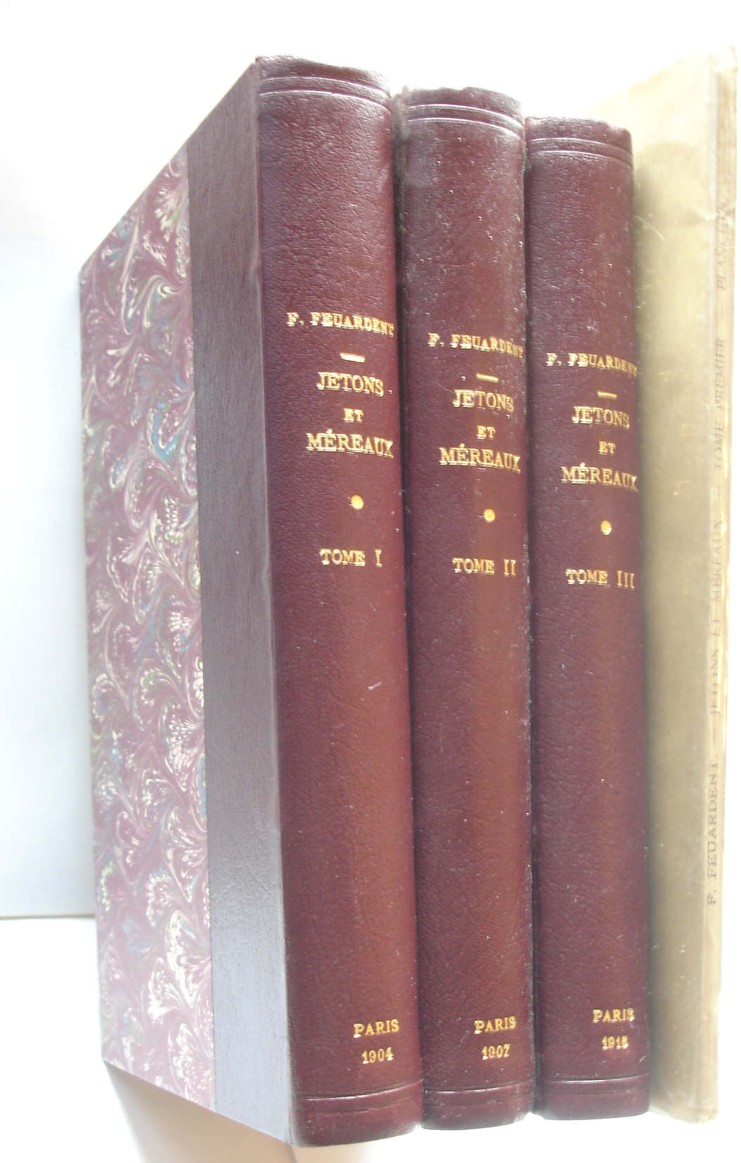 Avers : In-8• (16 x 23 cm). Trois volumes de XVI + 503 p., 517 p. et 506 p. ainsi qu’un tome IV (19 x 28 cm) de 16 p. + XXII pl. (+ 6 planches du Rouyer). Reliure des trois premiers volumes avec dos en simili-cuir rouge-marron et pièce de titre doré. Très bon état de l’ensemble pour les quatre premiers volumes. Volume de planche à relier.