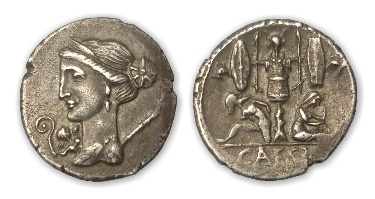 Revers : R/ CAESAR à l’exergue. Trophée gaulois formé d’un casque, d’une cuirasse, de boucliers, de lances et de deux carnyx, au pied du trophée, deux gaulois assis, celui de droite pleurant, celui de gauche, les mains attachées dans le dos.