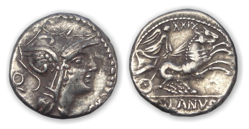 R/ D.SILANVS L F // ROMA Victoria (la Victoire) dans un bige galopant à droite, tenant les rênes des deux mains, au-dessus, marque de contrôle, XXIX.