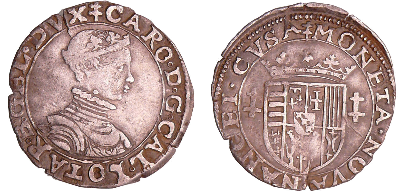 Avers : Charles III le grand duc (1545-1608). A/ (croix de Lorraine) CARO. D: G: CAL: LOTAR. B. GEL. DVX. Buste couronné et cuirassé à droite, le col légèrement fraisé.