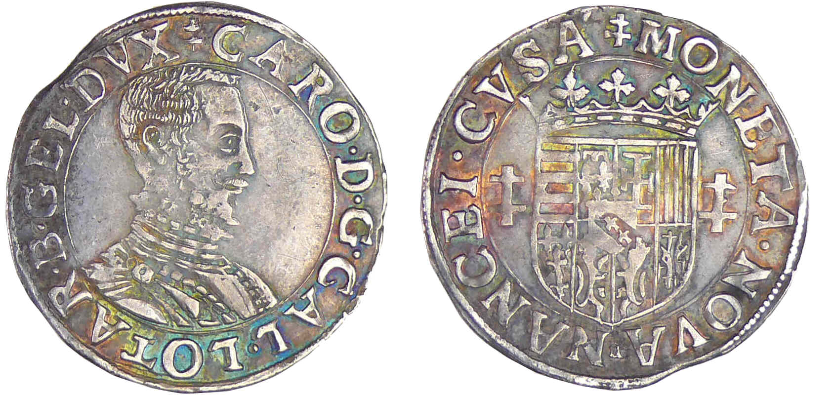 Avers : Charles III le grand duc (1545-1608). A/ + CAROL D. G: CAL. LOTAR. B. GEL. DVX. Buste barbu et vieilli, la tête nue à droite de Charles III, cuirassé.